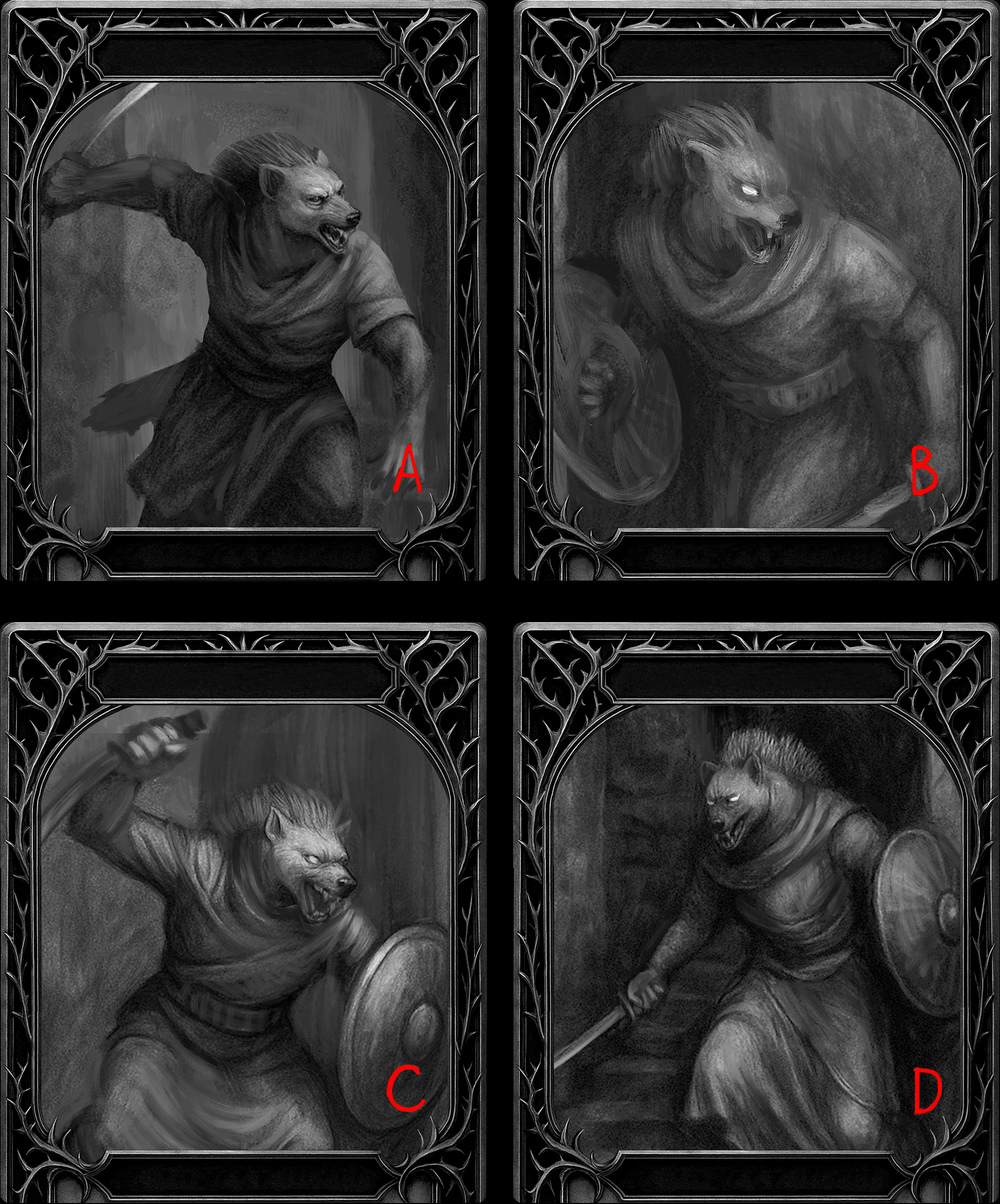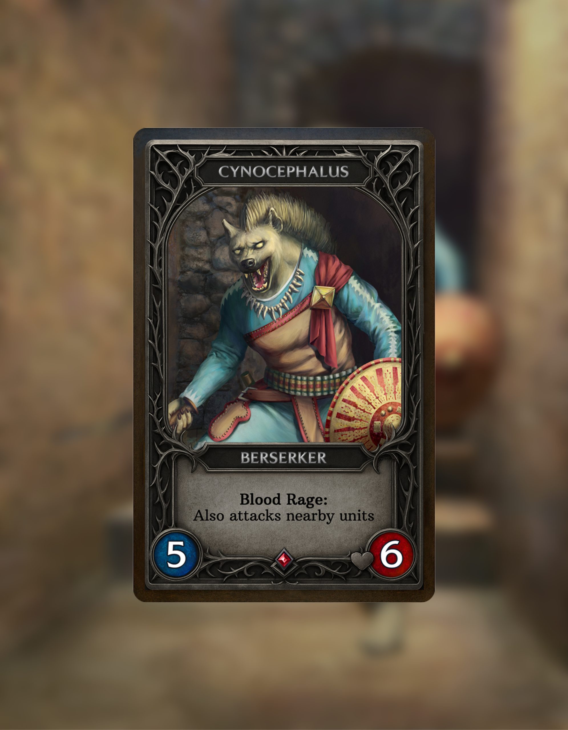 Another card for Tyrvain, this time we dive into a dark fantasy atmosphere. The fierce cynocephalus berserker became the new hero of my illustration. I strived to meticulously translate his appearance and the general mood of dread, staying true to the concept I developed over a long time. This character design is inspired by the traditional attire of an Ethiopian warrior, as this cynocephalus hails from the African continent.