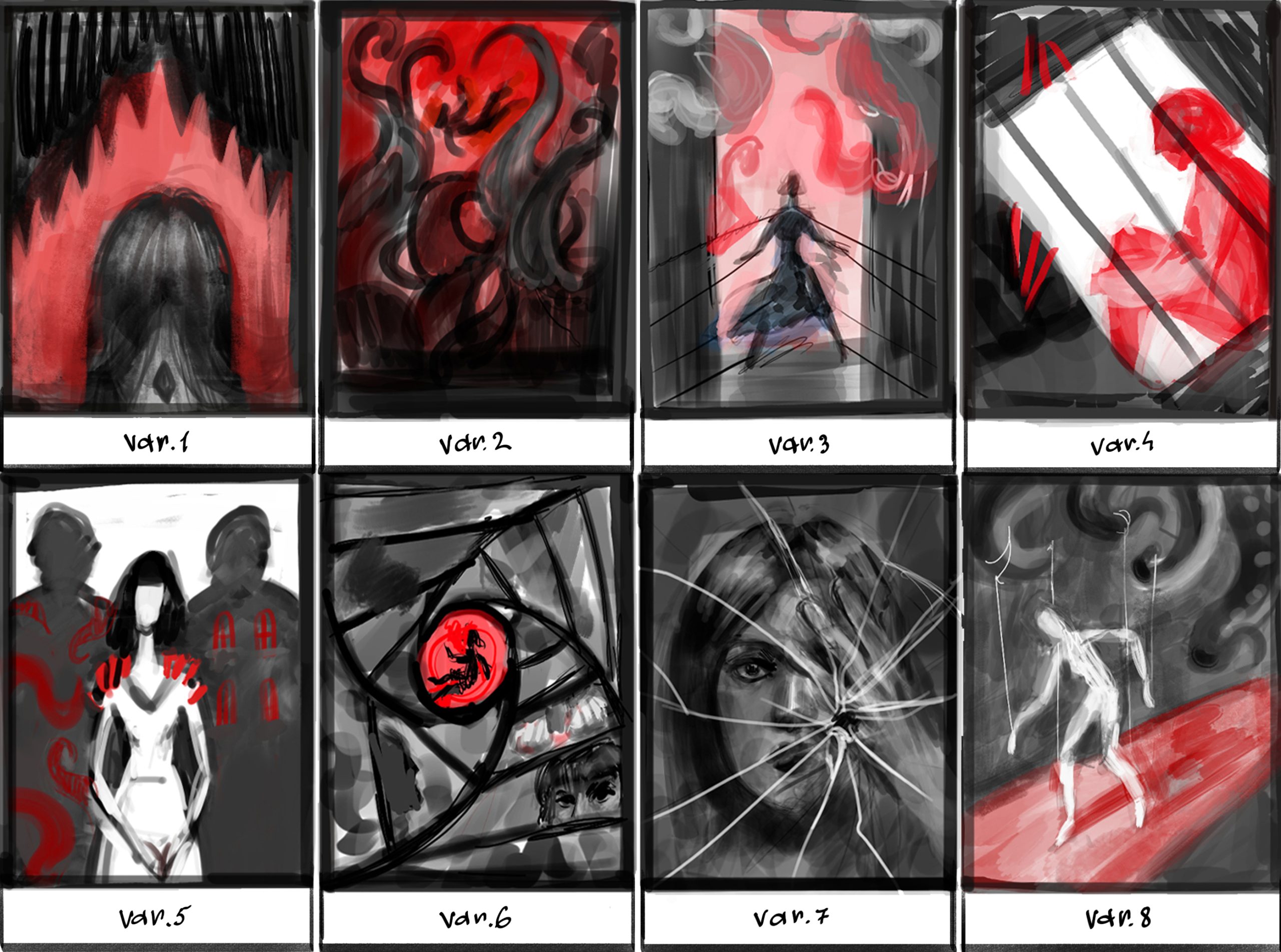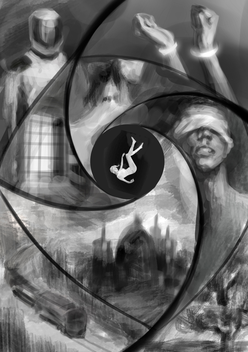 The spiral, the pattern of which became fundamental in the composition of the painting, made it possible to prepare the reader for a dynamic and unusual plot, a rather gloomy world and a generally disturbing atmosphere of the book. The shades of colors, poses, and faces ultimately helped to achieve the desired impression. Definitely, this experience of creating digital illustrations has become special for me.